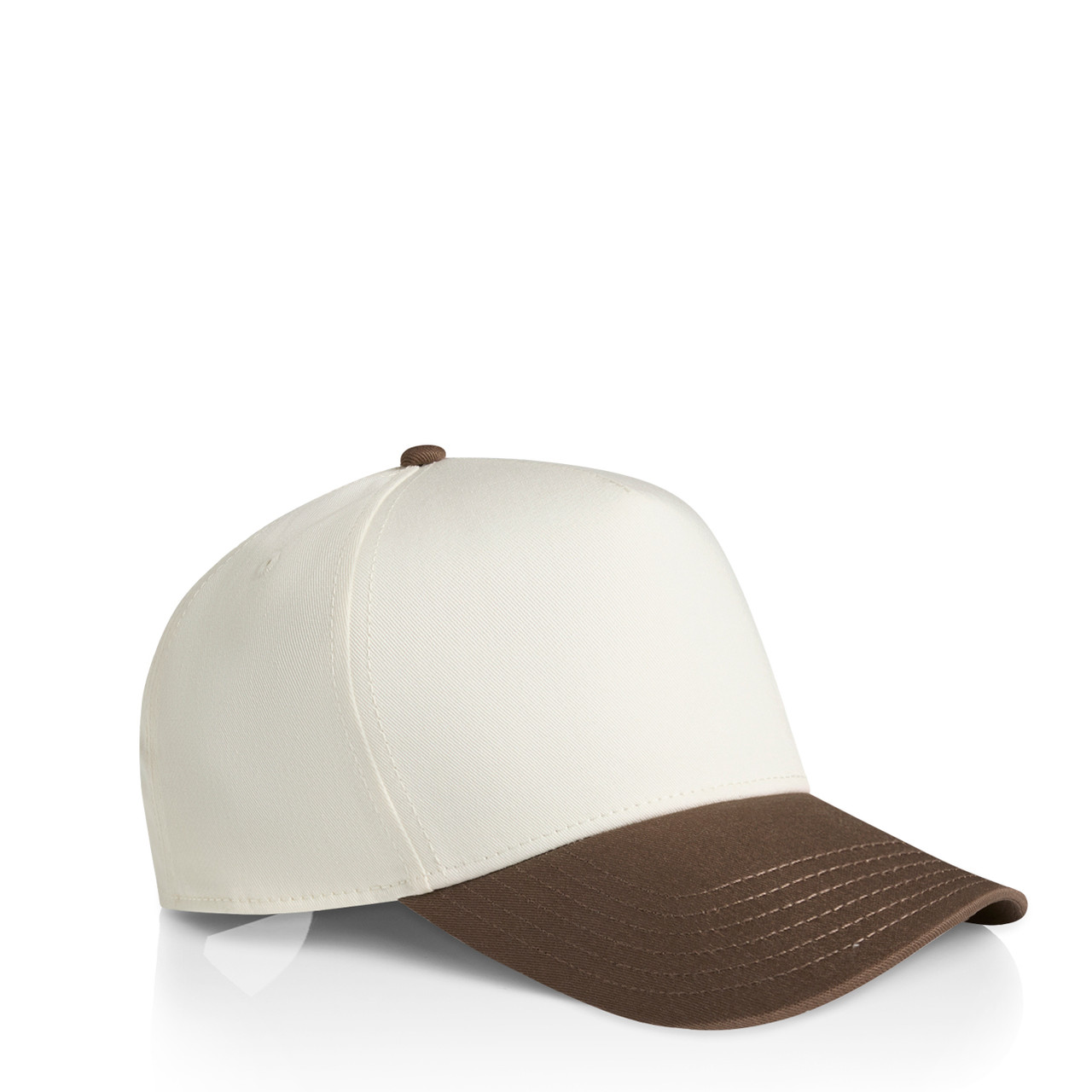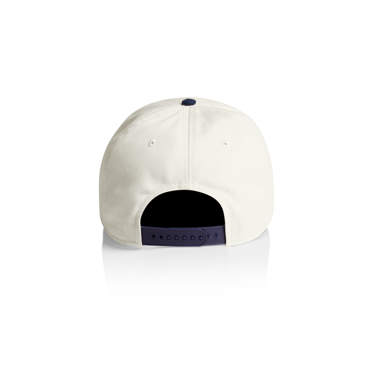 Introducing the Frame Two-Tone Cap, featuring a high profile design made from mid-weight 100% cotton. It has a structured front, contrast dome, plastic snapback, curved peak, and tonal eyelets.