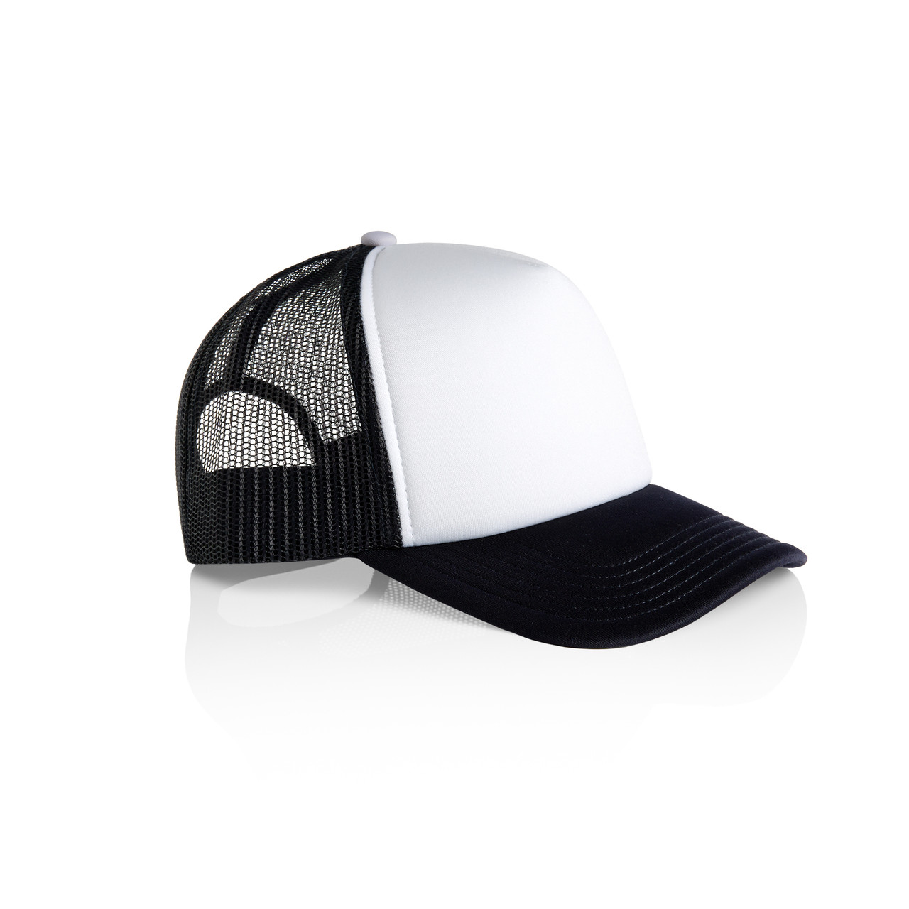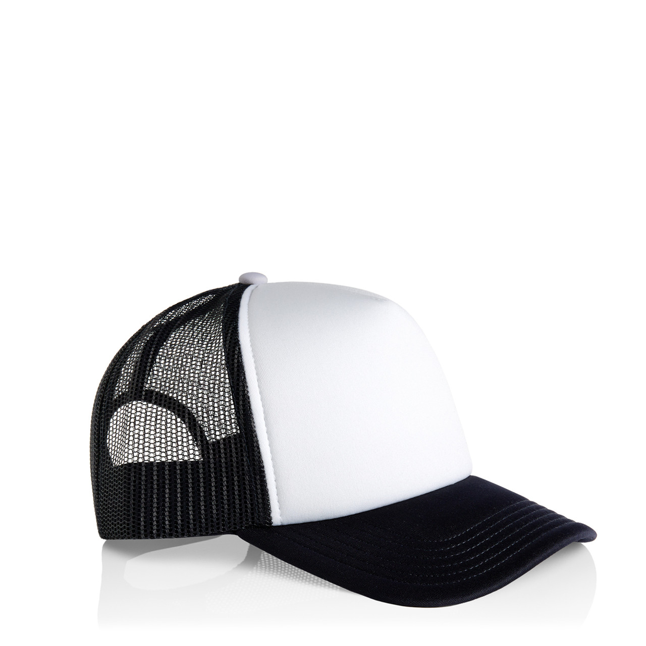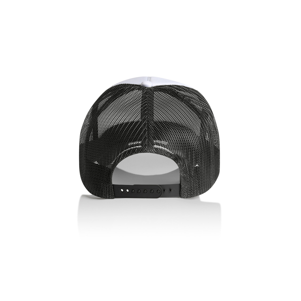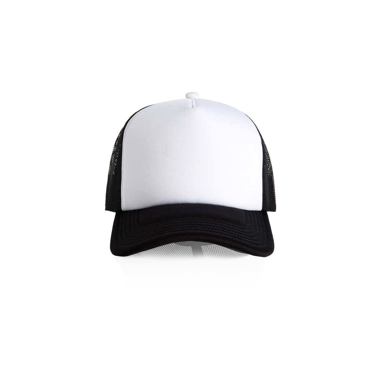 Explore the AS Colour Frame Two-Tone Trucker Cap: A high-profile snapback with a curved peak, crafted from mid-weight 100% polyester foam front and peak, paired with a 100% recycled polyester mesh back. Includes a contrasting front foam panel, plastic snapback closure, tonal under-peak lining, and tear-out AS Colour label for customized comfort.